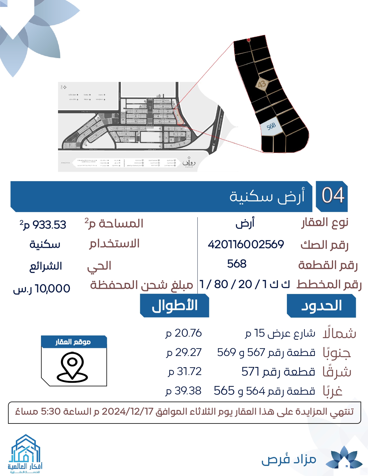 4 – ارض سكنية حي الشرائع مساحة 933.53م قطعة 568
